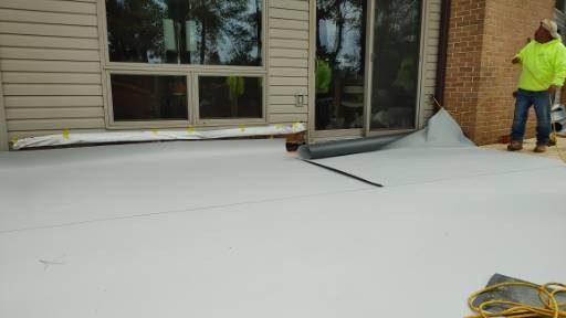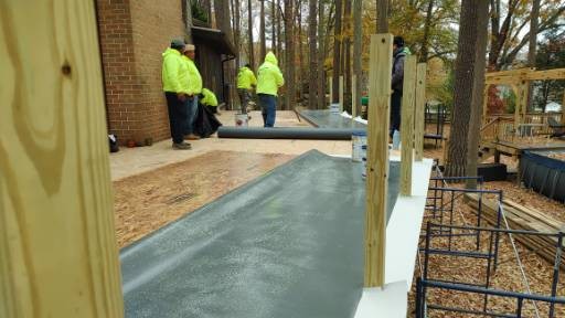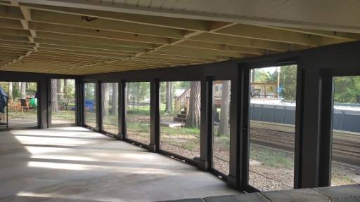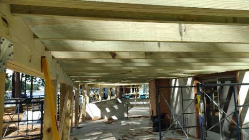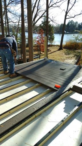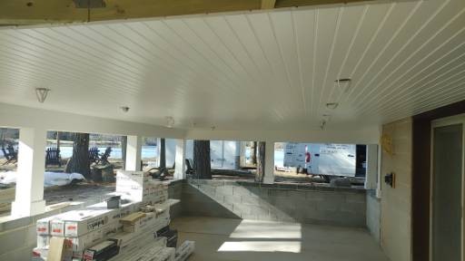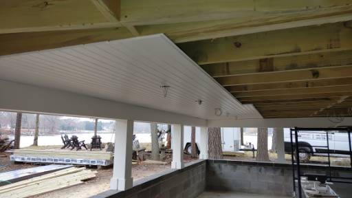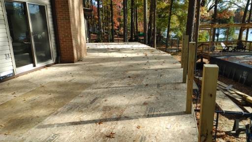 To protect the space below, we installed ¾” tongue-and-groove Advantech sheathing over the deck joists, followed by a commercial-grade vinyl membrane system properly sloped to ensure effective water drainage. Pressure-treated sleepers with padding strips were then installed over the membrane to create a level deck surface while preserving the integrity of the waterproofing system.