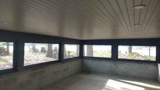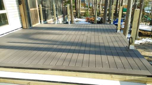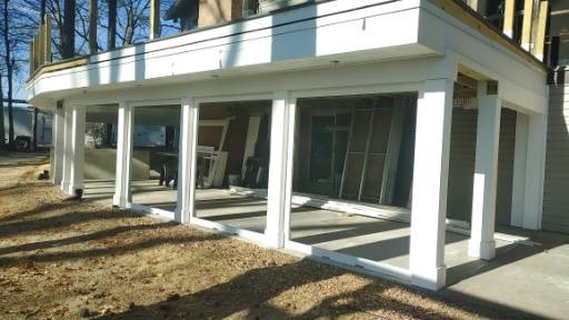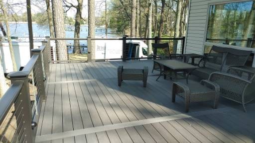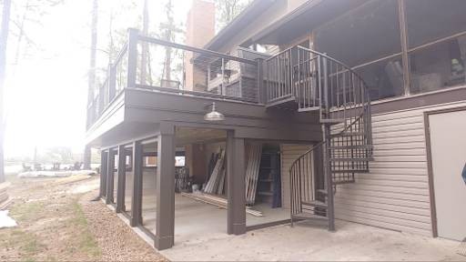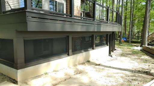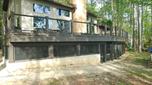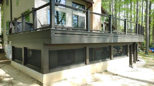 The finished deck features durable TimberTech decking paired with sleek stainless steel cable railings, combining long-term performance with a modern aesthetic. The entire ground level beneath the deck was enclosed using the Nana screening system, creating a functional and comfortable screened area. To complete the project, we reinstalled the homeowner’s existing spiral staircase and replaced the stair treads to match the new decking, delivering a cohesive and thoughtfully crafted outdoor living space.
